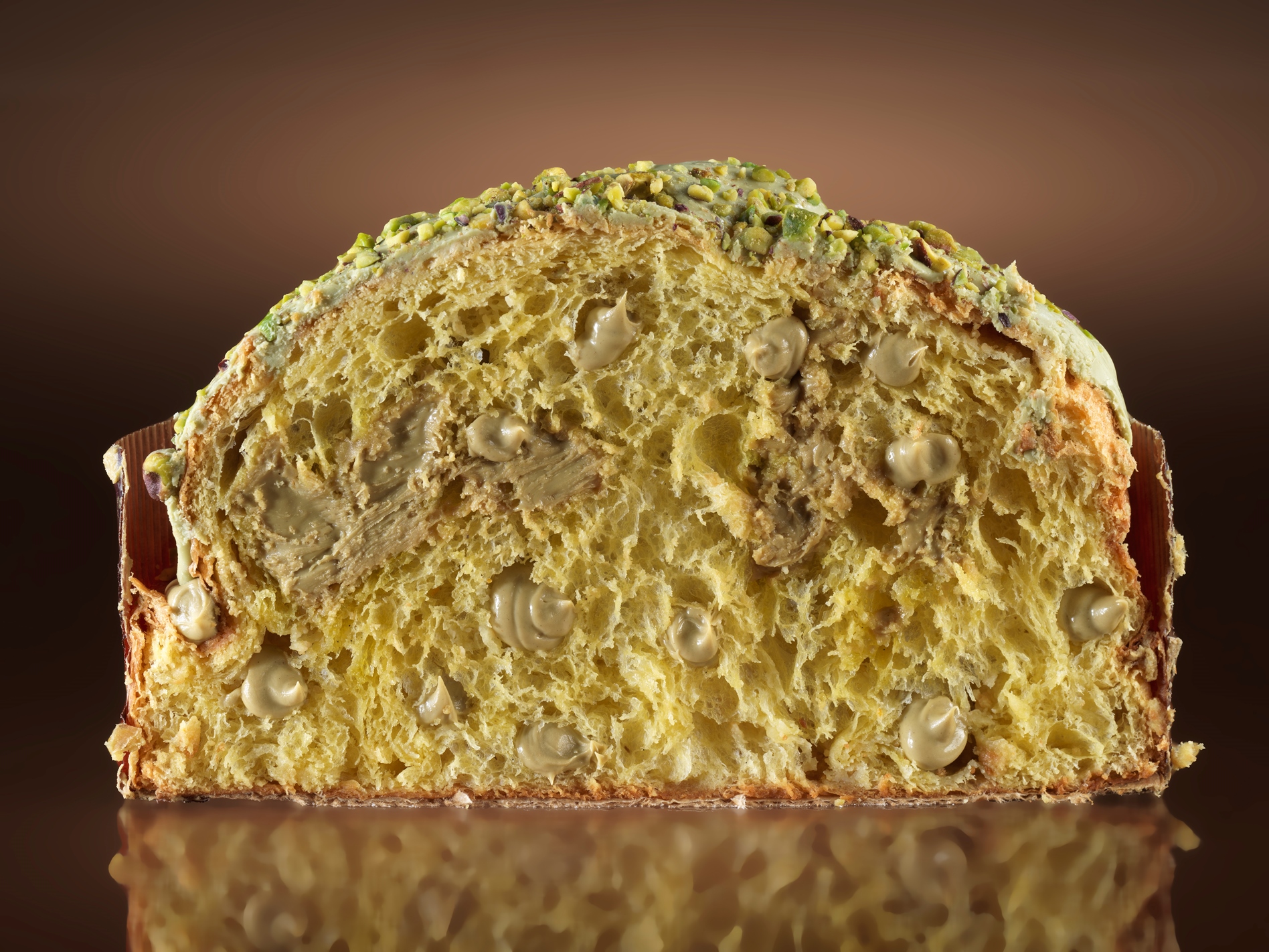 impasto panettone pistacchio (farina di frumento tipo 00, tuorlo d’uovo, zucchero semolato bianco, latte di vacca pastorizzato intero, acqua, lievito madre (farina di frumento tipo 00, acqua), zucchero, panna 38%, burro, farina di grano tenero maltato, sale, scorzone di arancia (sciroppo di glucosio, fruttosio, zucchero), miele millefiori, pasta vaniglia (zucchero invertito 70%, vaniglia, alcool 90°), burro concentrato, marsala superiore oro secco, cioccolato bianco (zucchero, burro di cacao, latte in polvere, siero di latte in polvere, emulsionante: lecitina di soia. aroma). crema spalmabile al pistacchio (zucchero, oli e grassi vegetali non idrogenati (oli (girasole), grassi (palma)), pistacchi, latte scremato in polvere, siero di latte in polvere, lattosio, coloranti (antociani, curcumina), emulsionante (E322 lecitina di girasole), aroma (vanillina)), copertura panettoni pistacchio (cioccolato bianco (zucchero, burro di cacao, latte in polvere, siero di latte in polvere, emulsionante: lecitina di soia. aroma), crema spalmabile al pistacchio (zucchero, oli e grassi vegetali non idrogenati (oli (girasole), grassi (palma)), pistacchi, latte scremato in polvere, siero di latte in polvere, lattosio, coloranti (antociani, curcumina), emulsionante (E322 lecitina di girasole), aroma (vanillina)), granella di pistacchio. PER GLI ALLERGENI VEDI INGREDIENTI IN GRASSETTO E SOTTOLINEATI. PUO CONTENERE TRACCE DI: Sedano, Crostacei, Uova, Pesce, Glutine, Latte, Molluschi, Senape, Frutti a guscio / Noci, Arachidi, Semi di sesamo, Soia, Anidride solfosa / Solfiti.